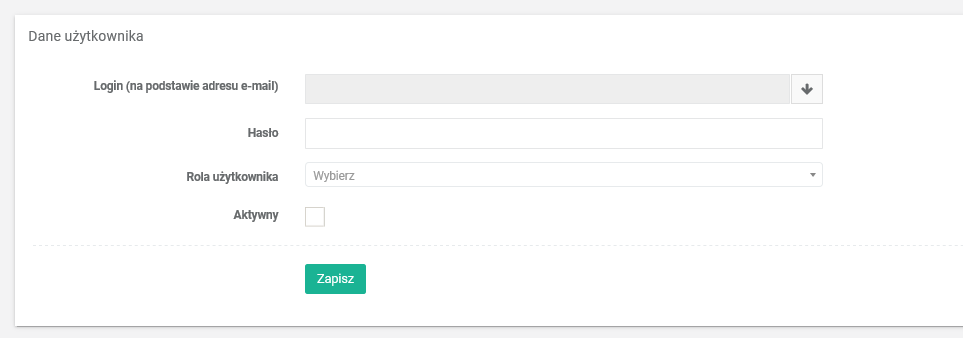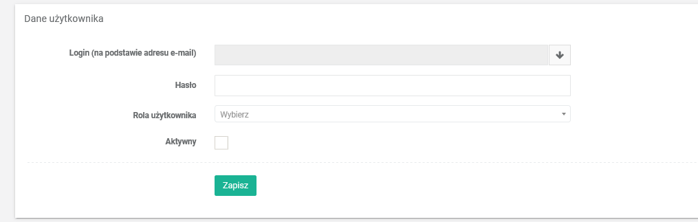 Po uzupełnieniu wszystkich danych klikamy Zapisz i na karcie użytkownika pojawia się dodatkowa część Dane użytkownika, w której możemy ustawić jego login i hasło oraz aktywować konto i przypisać mu odpowiednią rolę (Administratora, Kierownika lub Handlowca).