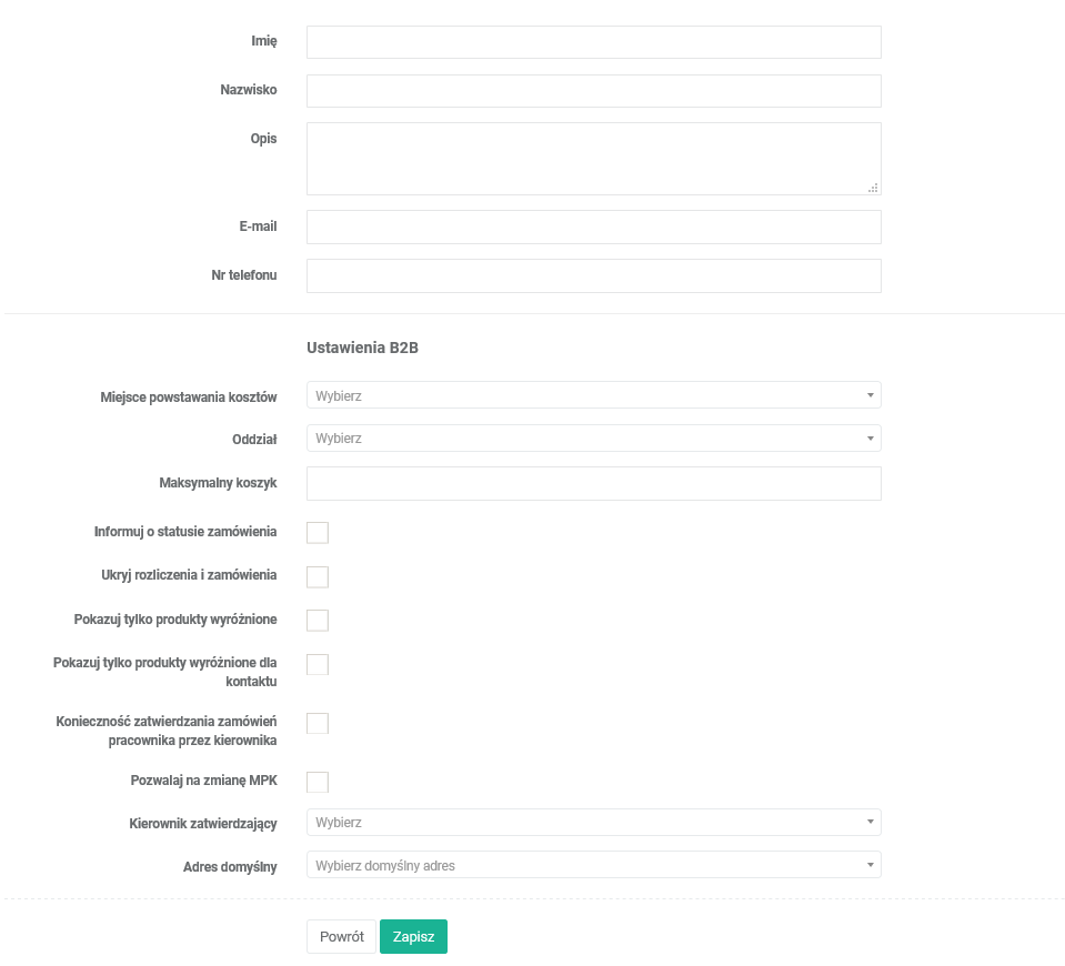 W tym miejscu można dodawać osoby kontaktowe. Następnie edytując osobę kontaktową w części Dane użytkownika można nadać dostęp do platformy B2B podając login (adres email) i hasło.
