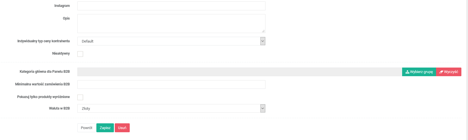 Kolejna cześć poniżej Opisu, to pola pozwalające na wprowadzenie ustawień związanych z platformą B2B.
