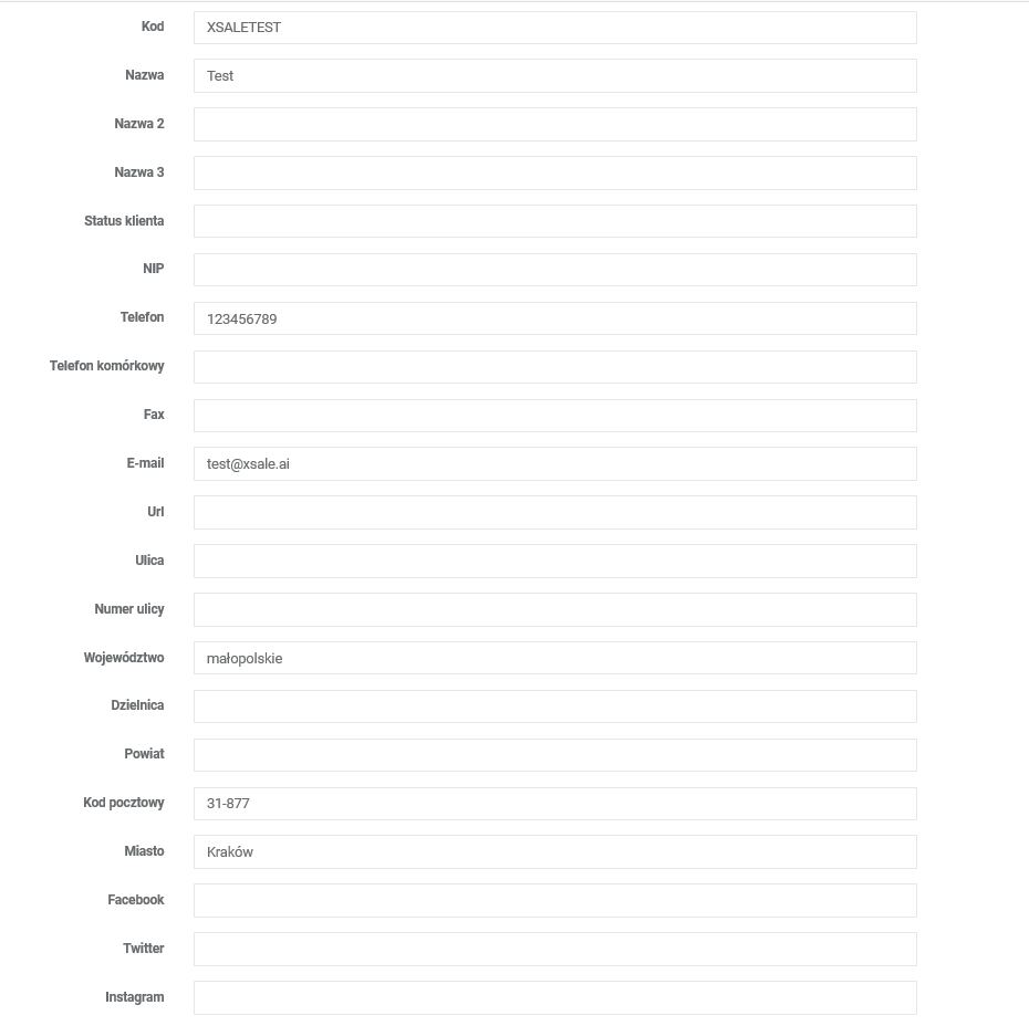 Pierwsza część karty kontrahenta w xSale, to pola zawierające nazwę i dane adresowe.