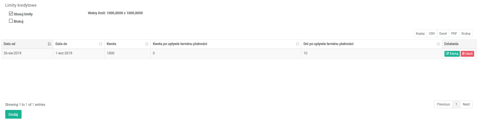 - Część Limity kredytowe zawiera ustalone limity kredytowe dla kontrahenta.