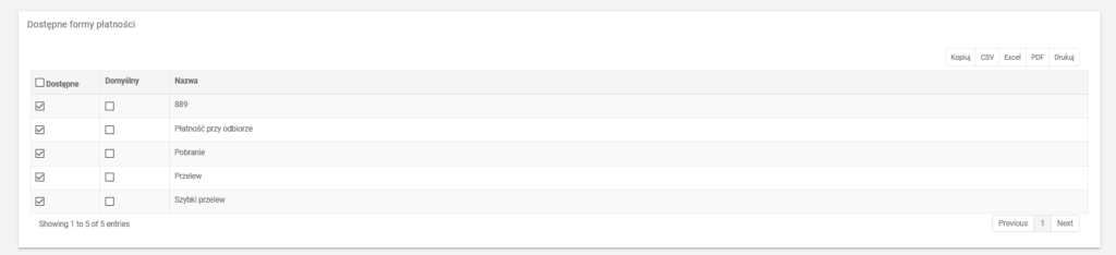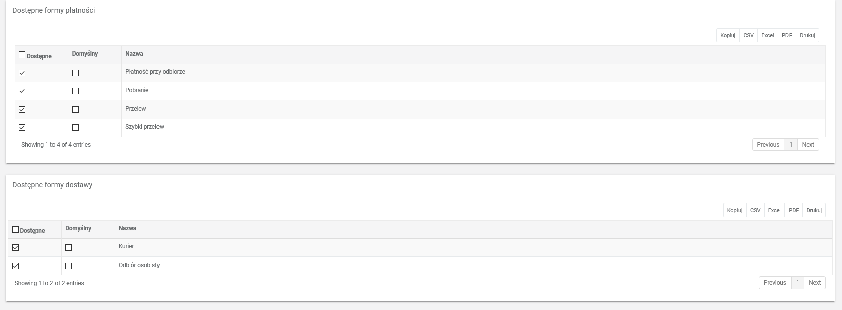 Na karcie użytkownika można ustawić jakie formy płatności i dostawy będą dla niego widoczne, a także wybrać te domyślne.