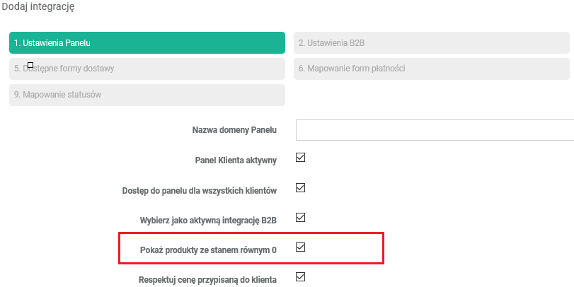 Jeżeli chcesz aby towary ze stanem magazynowym 0, były widoczne dla klientów możesz zaznaczyć odpowiednią flagę w konfiguracji integracji z B2B. Aby to zrobić wejdź w Konfiguracja –> Integracje i przy integracji z B2B kliknij Edytuj na kolejnym ekranie kliknij Zapisz i przejdź do instalatora. Na pierwszym kroku znajduje się flaga Pokaż produkty ze stanem równym 0 po jej zaznaczeniu przejdź wszystkie kroki instalatora i na końcu kliknij Zapisz.