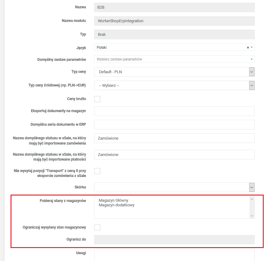 W konfiguracji integracji B2B można określić z jakich magazynów ma być pobierany stan magazynowy do B2B. Aby wybrać magazyny wejdź w Konfiguracja –> Integracje i edytuj integrację z B2B. W polu Pobieraj stany z magazynów zaznacz odpowiednie magazyny. Dodatkowo jest możliwość ograniczenia ilości wysyłanych stanów magazynowych.