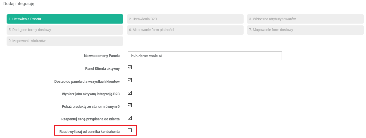 Jest możliwość konfiguracji sposobu wyliczania rabatów. Jeżeli rabat ma być liczony od ceny kontrahenta, to na konfiguracji integracji z B2B można zaznaczyć flagę Rabat wyliczaj od cennika kontrahenta. Aby zmienić konfigurację integracji z B2B wejdź w Konfiguracja –> Integracje i kliknij edytuj przy B2B. Następnie na kolejnym ekranie kliknij Zapisz i przejdź do instalatora. Konfiguracja wyliczania rabatów znajduje się na pierwszym kroku instalatora. Po zaznaczeniu odpowiedniej flgi przejdź wszystkie kroki instalatora i na ostatnim kroku kliknij Zapisz.