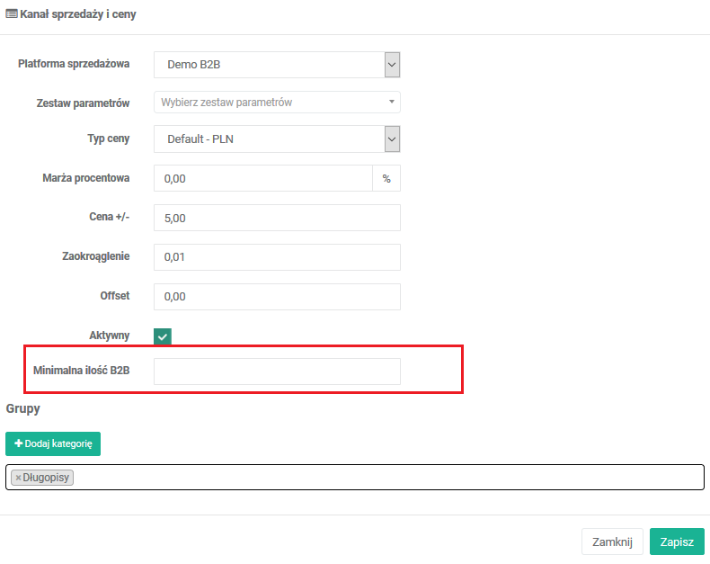 W polu Minimalna ilość B2B wpisujemy odpowiednią liczbę, np. 10 szt i klikamy Zapisz.