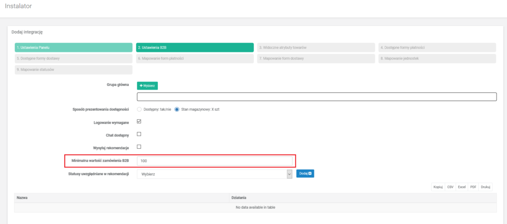- Minimalna wartość zamówienia dla całego B2B – obowiązuje dla wszystkich kontrahentów w całym B2B i można ją ustawić w konfiguracji integracji z B2B.