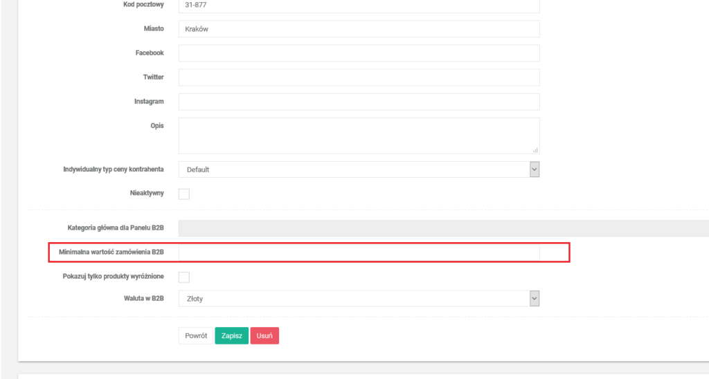 - Minimalna wartość zamówienia B2B – wpisujemy wartość minimalnego zamówienia dla kontrahenta.