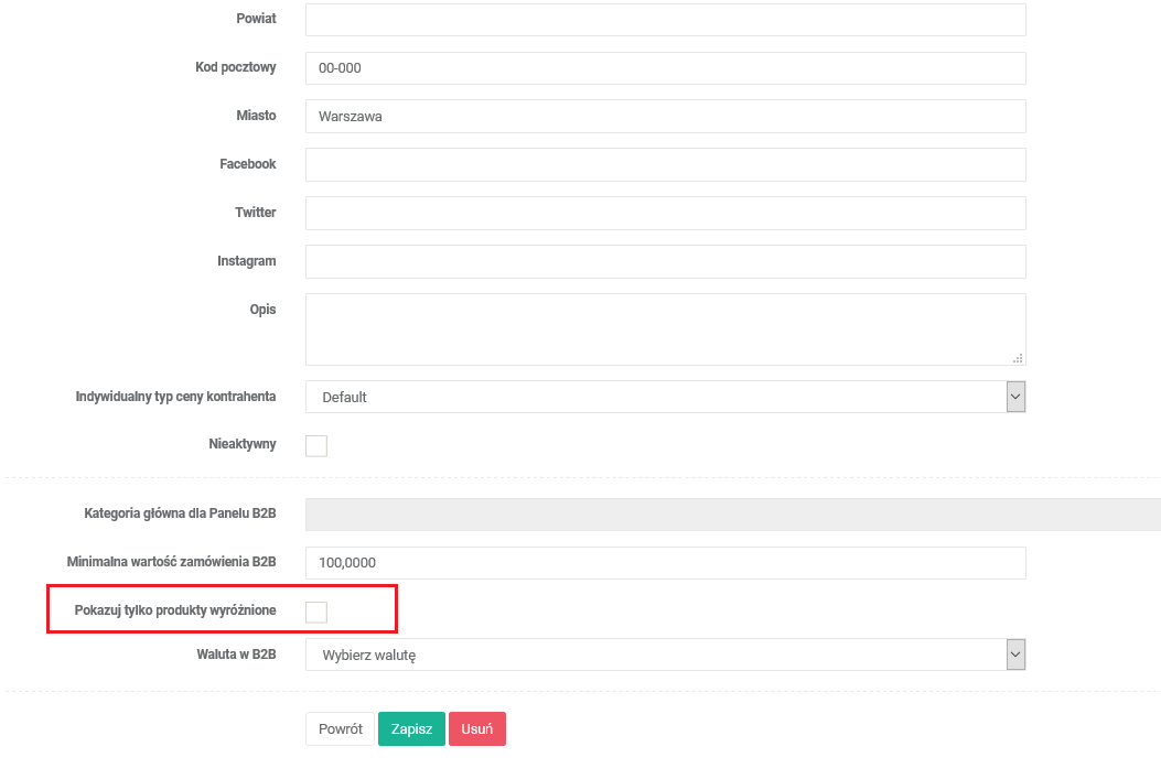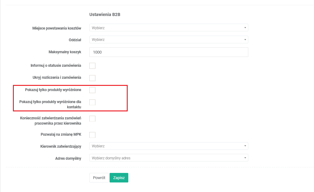 - Jeżeli dla kontrahenta mają być widoczne tylko produkty oznaczone jako wyróżnione w B2B, to zaznaczamy flagę Pokazuj tylko produkty wyróżnione.
