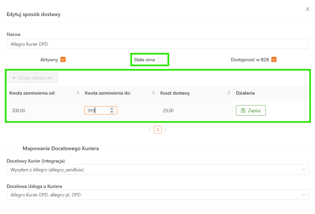 Ponadto, edytując każdy ze sposobów dostawy, można ustawić jego koszt jako stałą cenę lub zdefiniować cennik dostawy. Ustawiając zakresy cen w polu Kwota zamówienia od/do należy wpisać wartość zamówienia netto od zamówionych towarów.