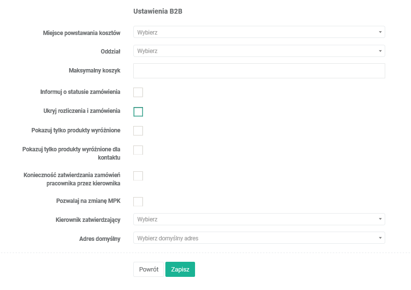 W części Ustawienia B2B wprowadzamy ustawienia związane z platformą B2B ustawiając np. miejsce powstawania kosztów, oddział, maksymalny koszyk, informuj o statusie zamówienia. itd.