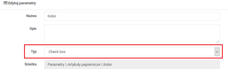 - Edytując parametr ustawiamy jego Typ, może to być np. check-box.