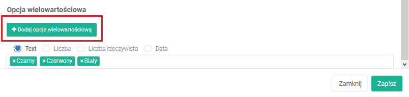 - W części Opcja wielowartościowa można przypisać wartości parametru, które będzie można przypisać do produktu na ofercie B2B i po których będzie można filtrować.