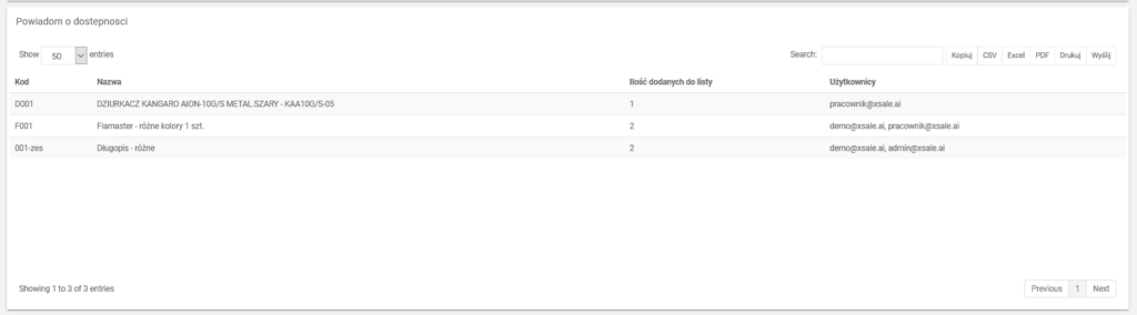 Na stronie głównej xSale można dodać wskaźnik z możliwością wyświetlania, jakie produkty klienci B2B mają dodane do „Powiadom o dostępności”. Wskaźnik pokazuje kod oferty, nazwę w domyślnym języku, ilość loginów mających dodaną ofertę do swojej listy oraz kolumnę z wyszczególnionymi użytkownikami (loginami), którzy dodali oferty do listy. Dane we wskaźniku są aktualizowane na bieżąco. Raport można eksportować do pliku CSV, Excel, PDF lub dodać do raportów cyklicznych.