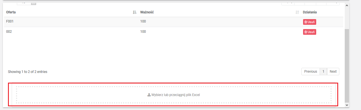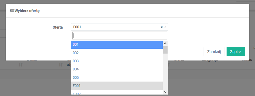 Klikając przycisk „+Dodaj” można ręcznie przypisywać oferty wpisując odpowiednio ich kody.