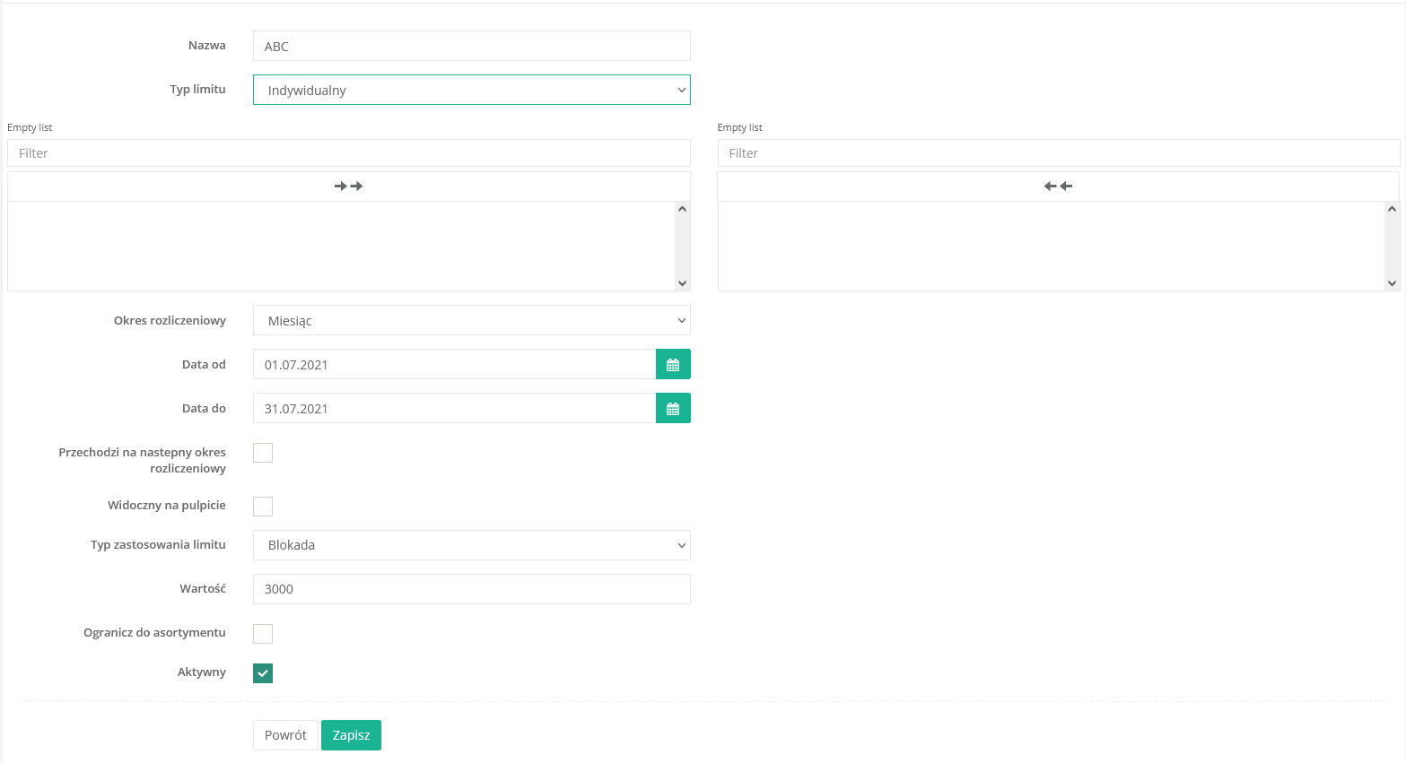 - Ogranicz do asortymentu – zaznaczenie opcji umożliwia przypisanie limitu na wskazaną grupę towarów.