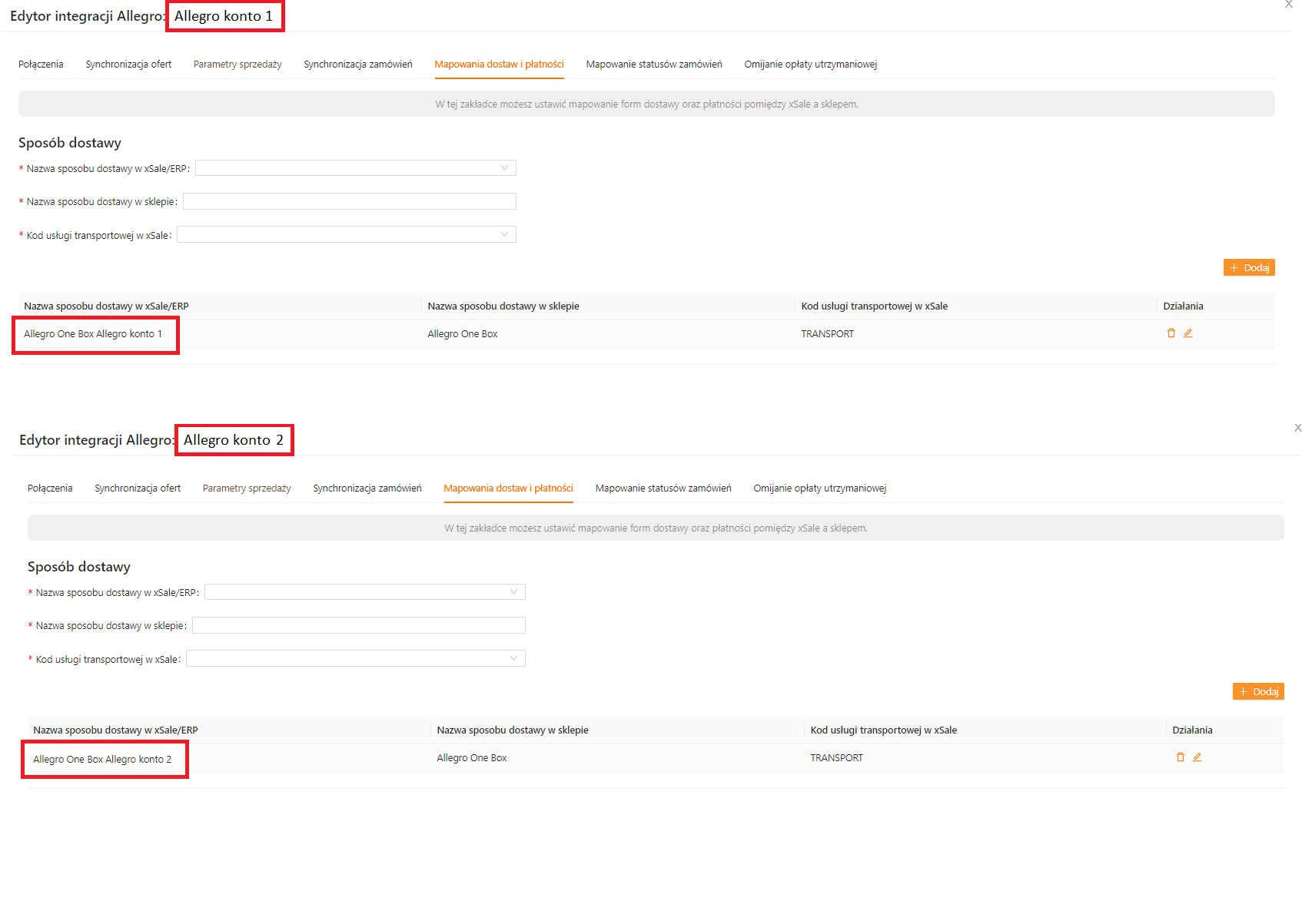 – Jeśli mamy dwa konta Allegro dodajemy dwa wpisy dla każdej metody dostawy „Allegro One Box Allegro konto 1” i i „Allegro One Box Allegro konto 2”