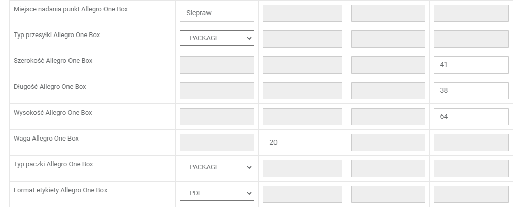 – Do prawidłowego działania integracji konieczne jest wypełnienie pól od „Nadawca ulica” do „Pobranie express” oraz pól związanych z używaną metodą dostawy. Przykładowo jeśli korzystamy z Allegro One Box wypełniamy też poniższe pola m.in