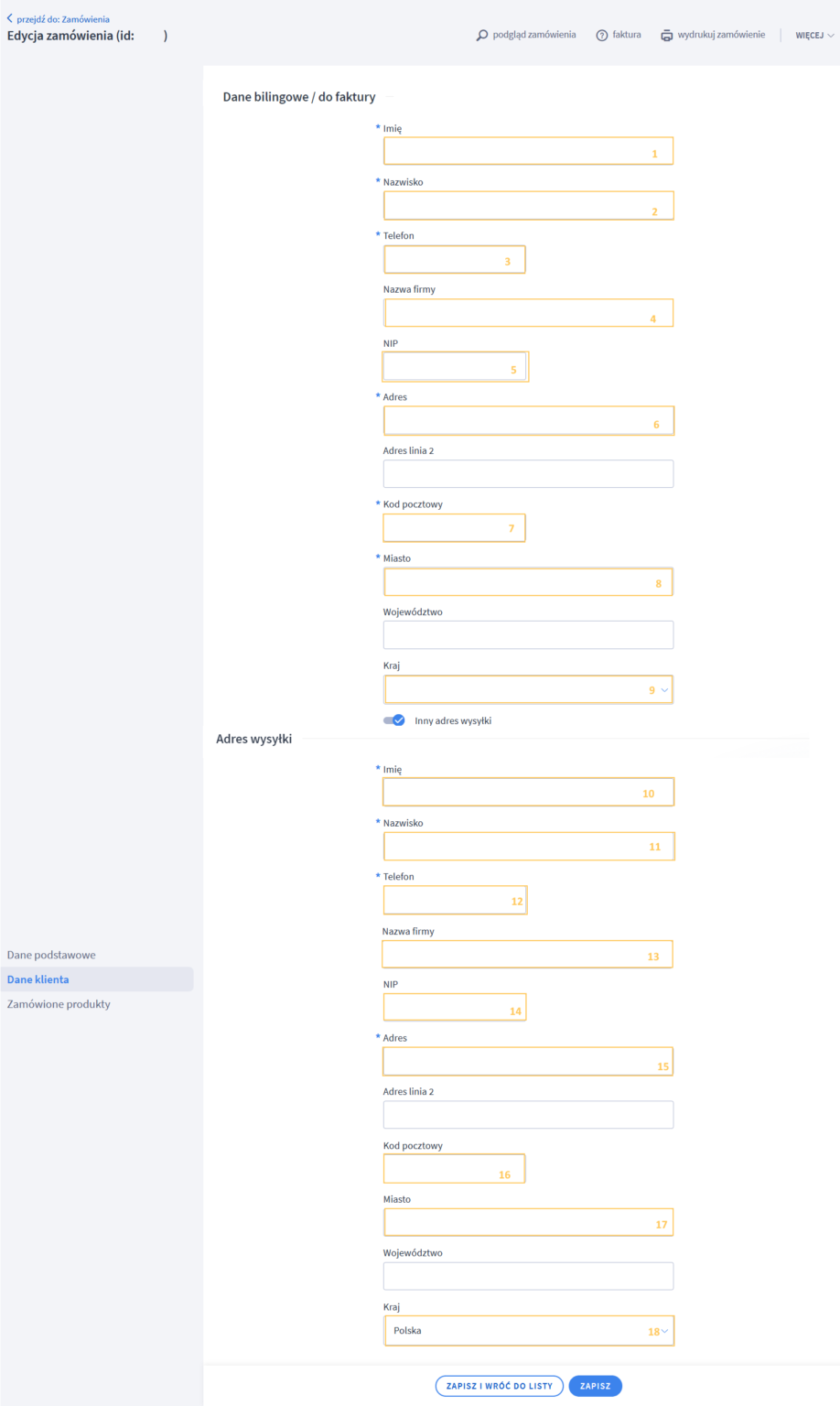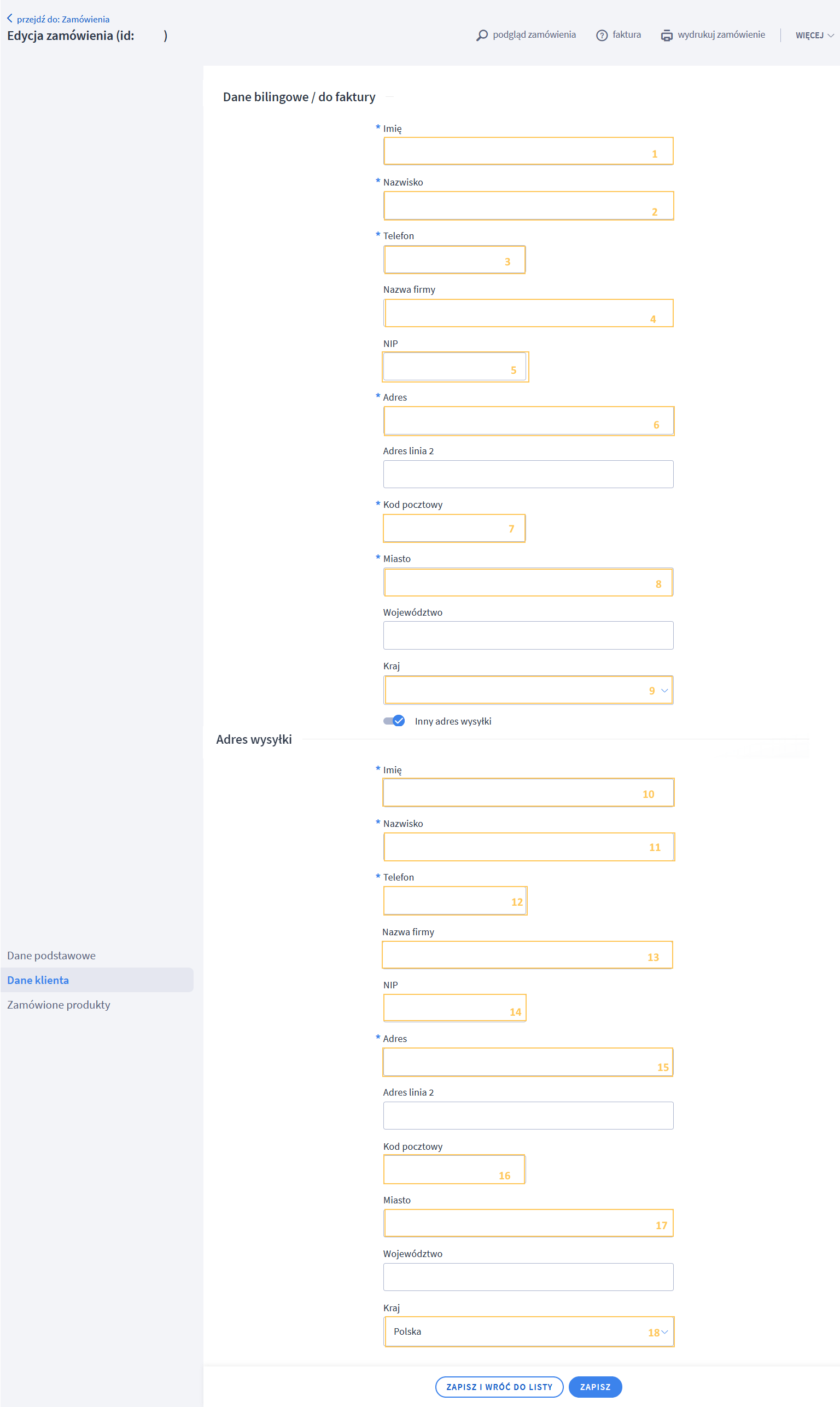 | Edycja zamówienia > Formularz adresu > Kupujący | 19 | Edycja Zamówienia > Dane klienta> Dane do faktury | Imię i nazwisko | 1,2 | Pole Nazwa 2 uzupełniane tylko gdy podano w polu Nazwa podano nazwę firmy. | |