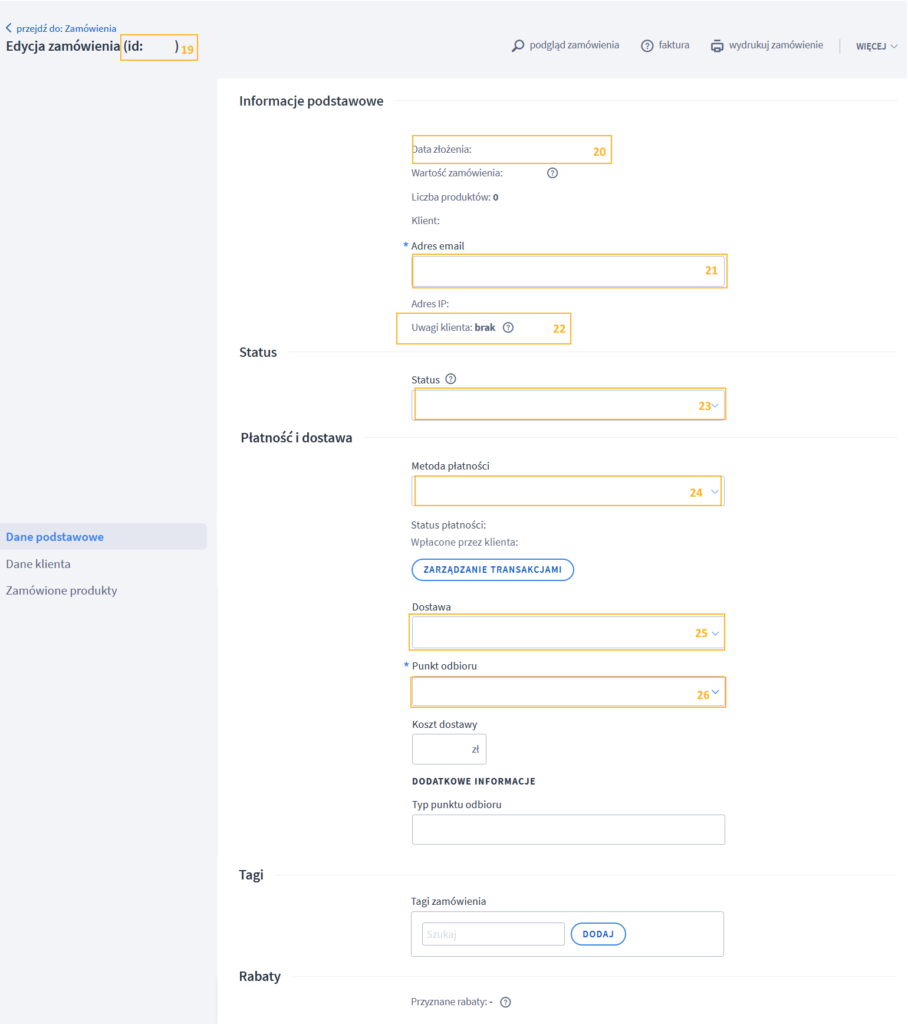 | Edycja zamówienia > Formularz adresu > Odbiorca | 13 | Edycja Zamówienia > Dane podstawowe > Informacje podstawowe | Adres e-mail | 21 | ||