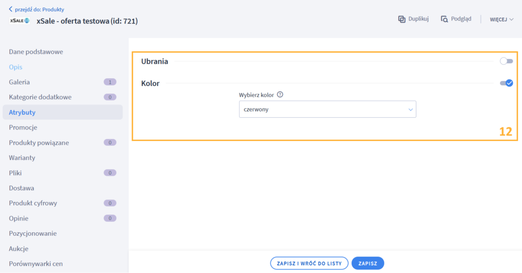 | Oferta -> Edycja -> Parametry | Parametry | 4 | Produkty > Edycja > Atrybuty | Parametr np. Kolor | 12 | |