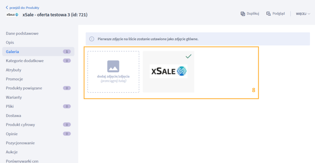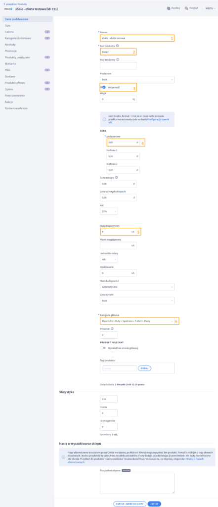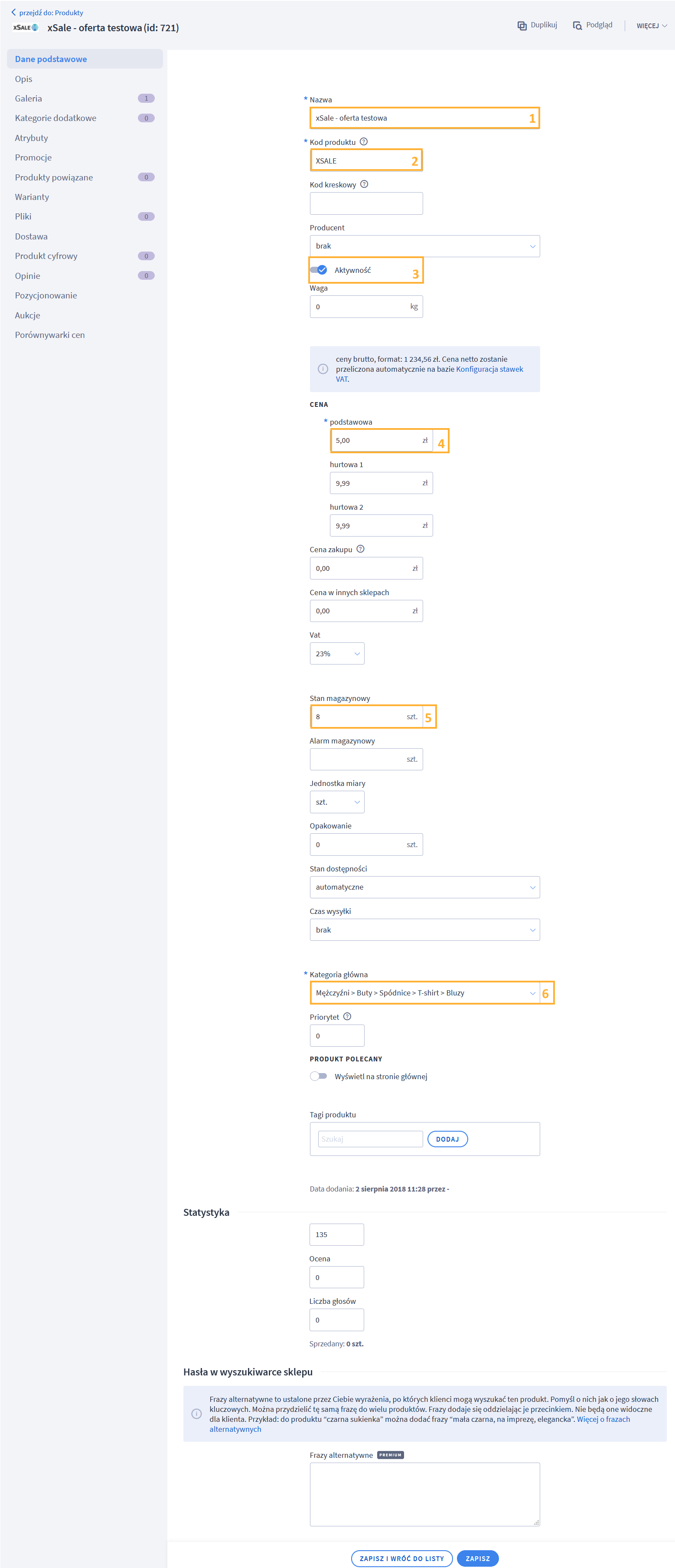 | Produkty > Edycja > Dane podstawowe | Aktywność | 3 | Pole automatycznie zaznaczone |