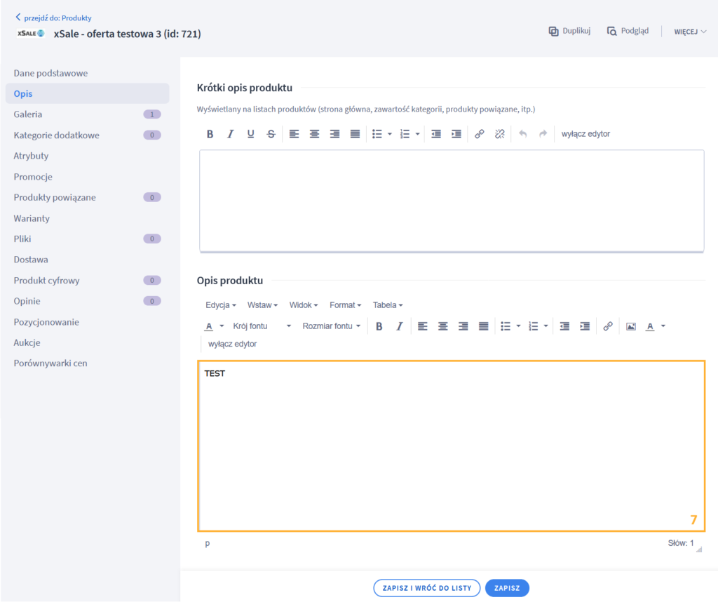 | Oferta -> Edycja -> Opis i nazwa oferty w poszczególnych językach | Opis (z języka domyślnego wybranego dla integracji) | 8 | Produkty > Edycja > Opis | Opis produktu | 7 | |