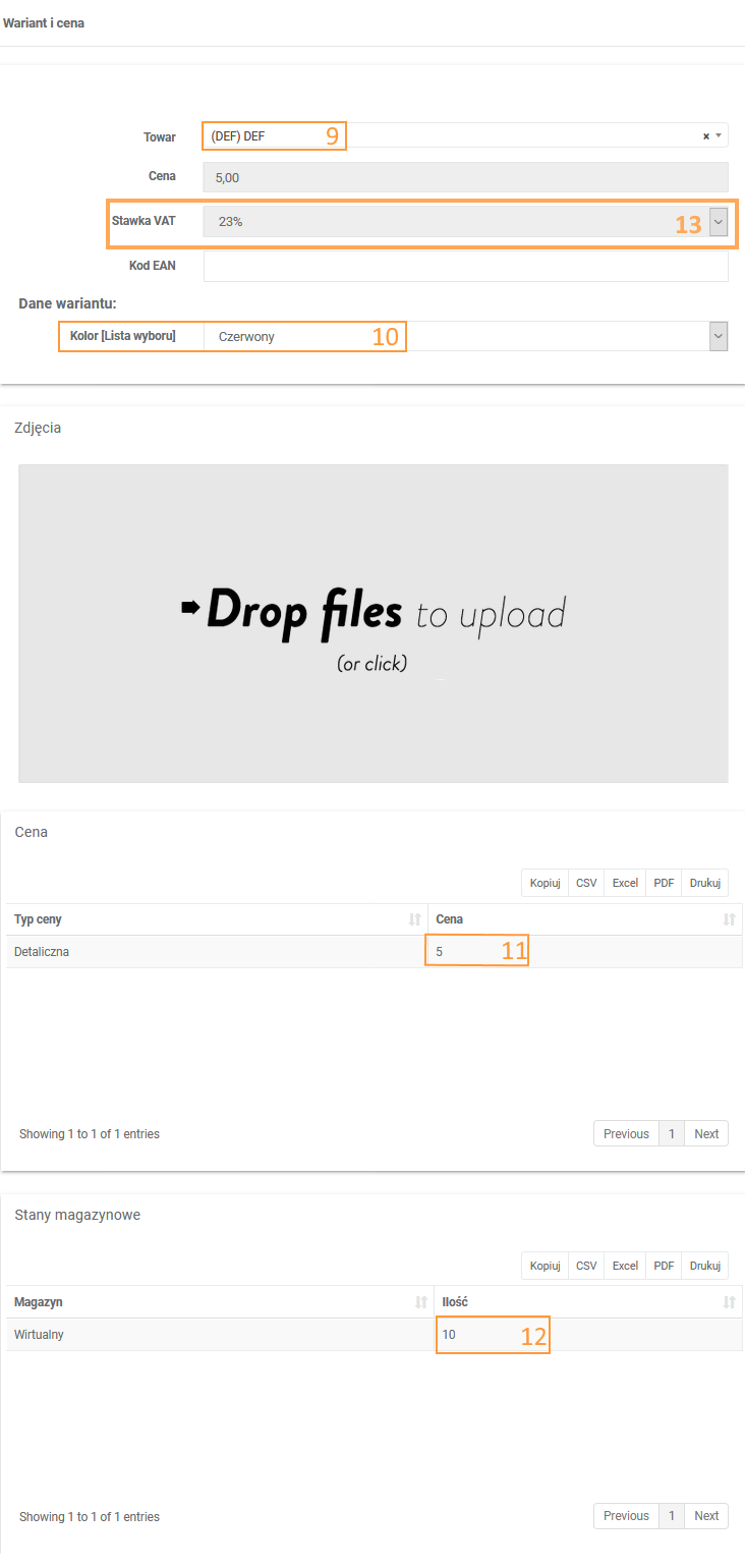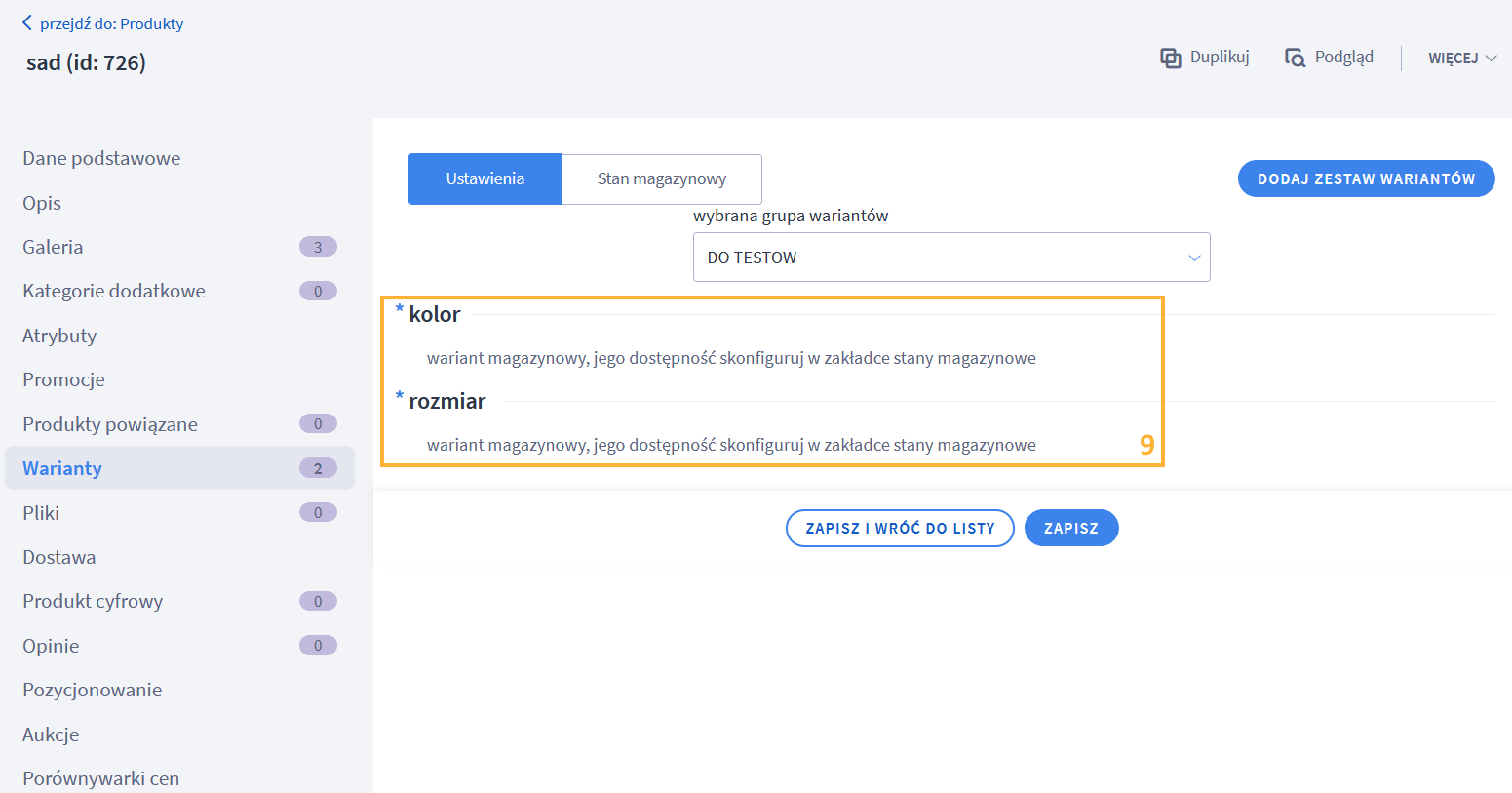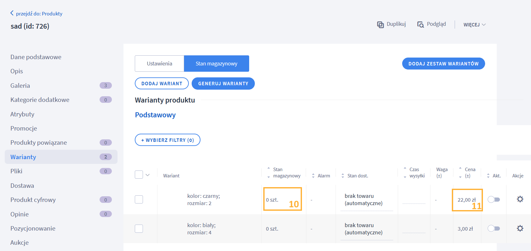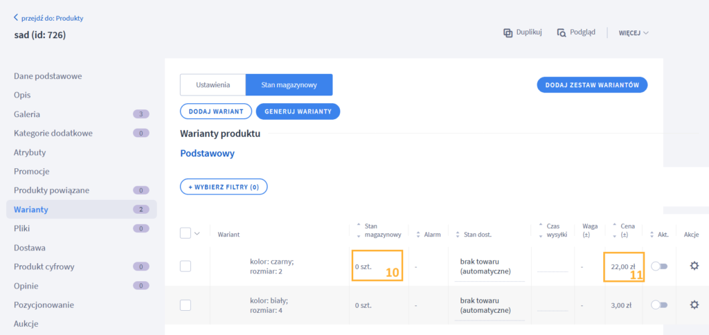 | Oferta -> Edycja -> Warianty i ceny -> Edytuj | Dane wariantu | 10 | Produkty > Edycja > Warianty | Wybrana grupa wariantów np. Rozmiar, Kolor | 9 | Dotyczy produktu z wariantami według wybranego parametru np. Kolor, Rozmiar. Wariant użyty do tworzenia oferty musi być z obsługą stanów magazynowych. |