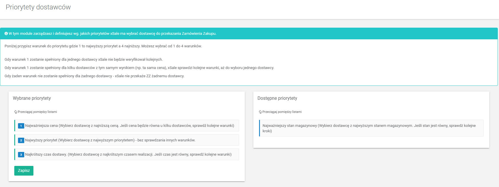 - Na liście integracji można dodać kliku dostawców, wtedy w module Priorytety dostawców można określić według jakich kryteriów będą wybierani dostawcy do przesłania zamówienia zakupu.