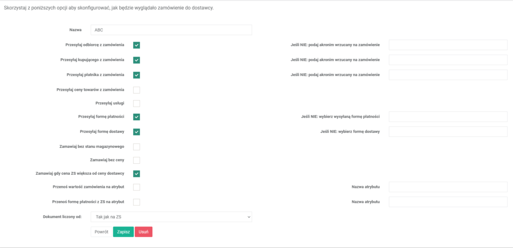 Przykładowo możemy odznaczyć przekazywanie danych odbiorcy, kupującego lub ceny zamówienia. W tej konfiguracji możemy też np. na sztywno ustawić akronim kontrahenta na którego będziemy tworzyć zamówienia u dostawcy.