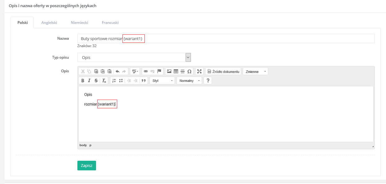 Po utworzeniu oferty wielowariantowej do nazwy i opisu automatycznie dodawana jest treść z wartością wybraną na konkretnym wariancie.