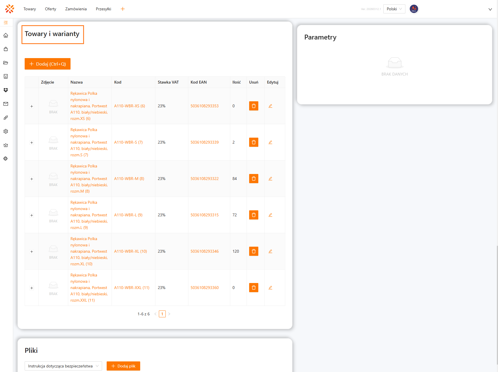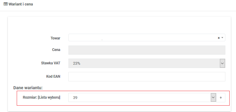 Przykład: oferta wielowariantowa, gdzie wariantem jest parametr Rozmiar.