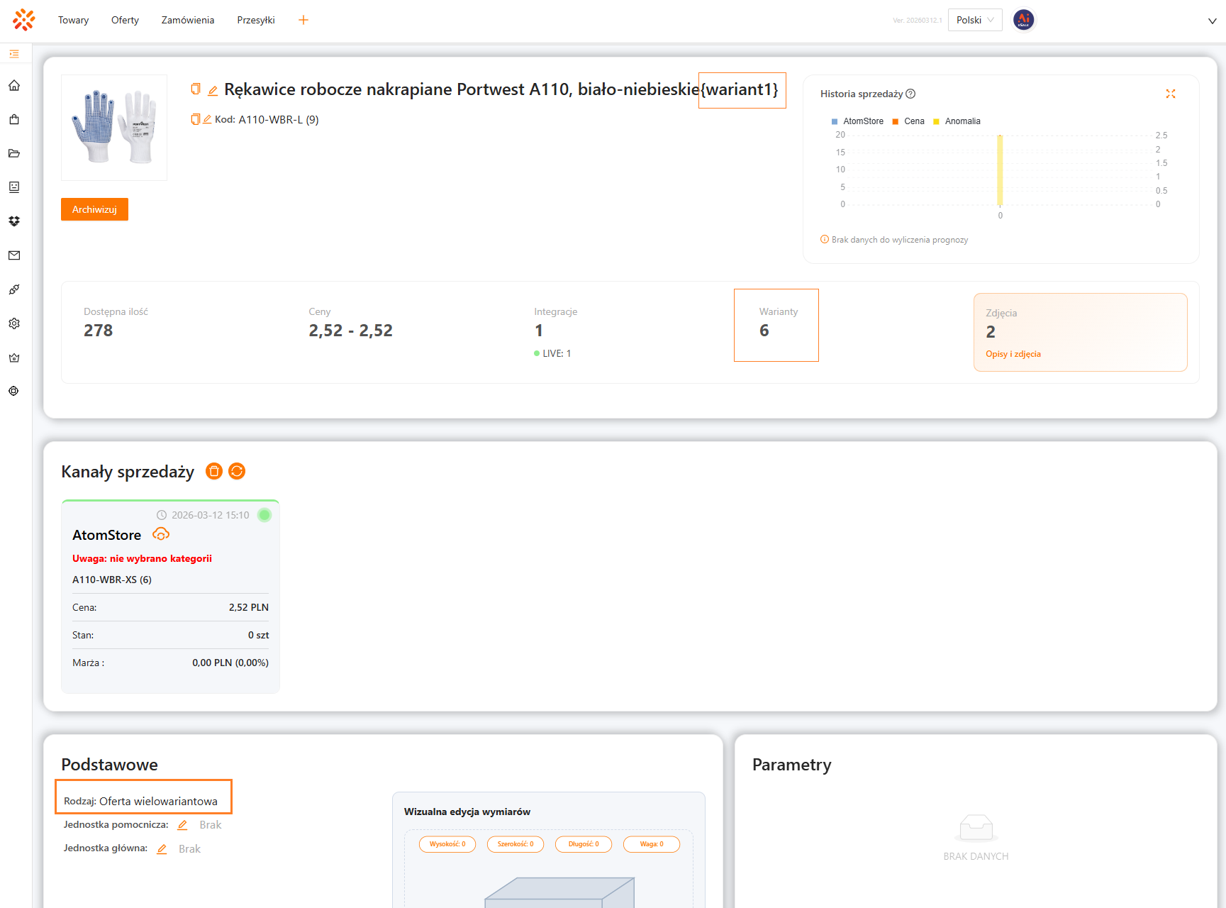 Ofertę wielowariantową możesz rozpoznać po tym, że w polu Warianty widoczna jest liczba wskazująca liczbę wariantów, a w sekcji Podstawowe znajduje się informacja Rodzaj: Oferta wielowariantowa.
