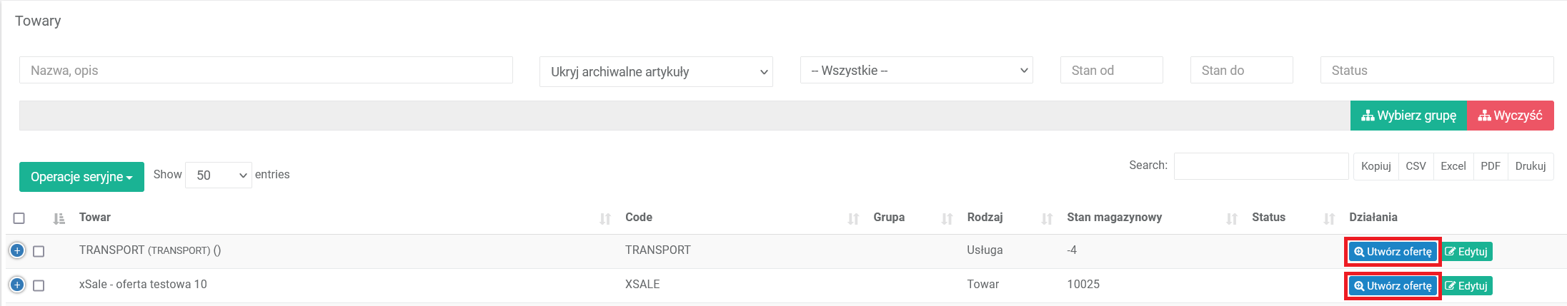 - Stwórz zestaw – tworzy ofertę typu zestaw, która może być powiązana z kilkoma towarami.