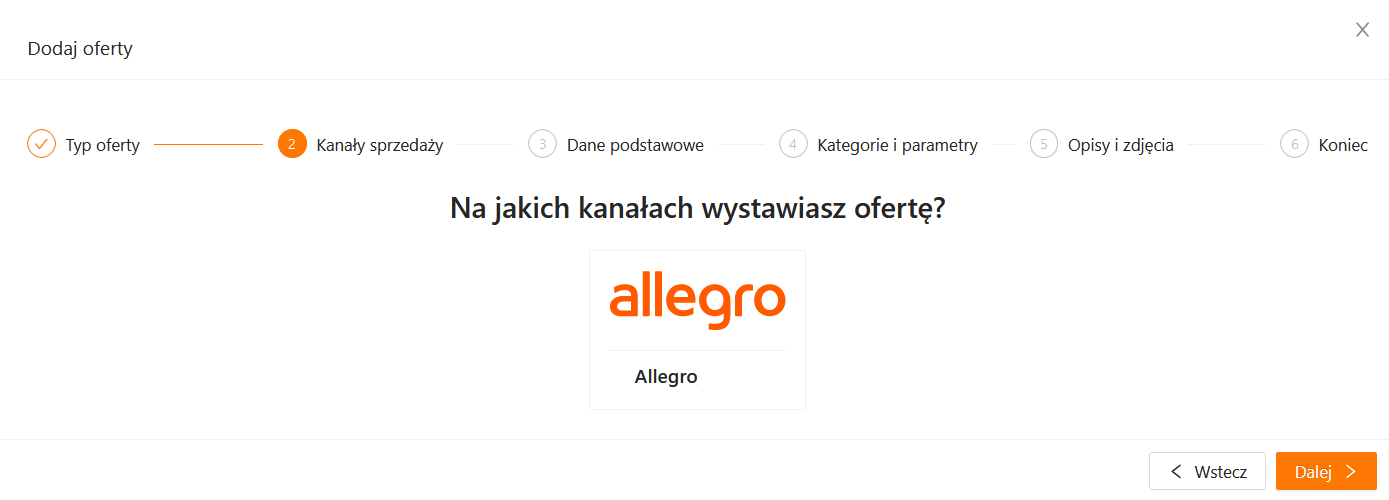 W drugim kroku wskaż kanały sprzedaży, na jakich oferta ma zostać wystawiona. Jeżeli w pierwszym kroku została wybrana oferta wielowariantowa, to możesz wybrać tylko jeden kanał sprzedaży.