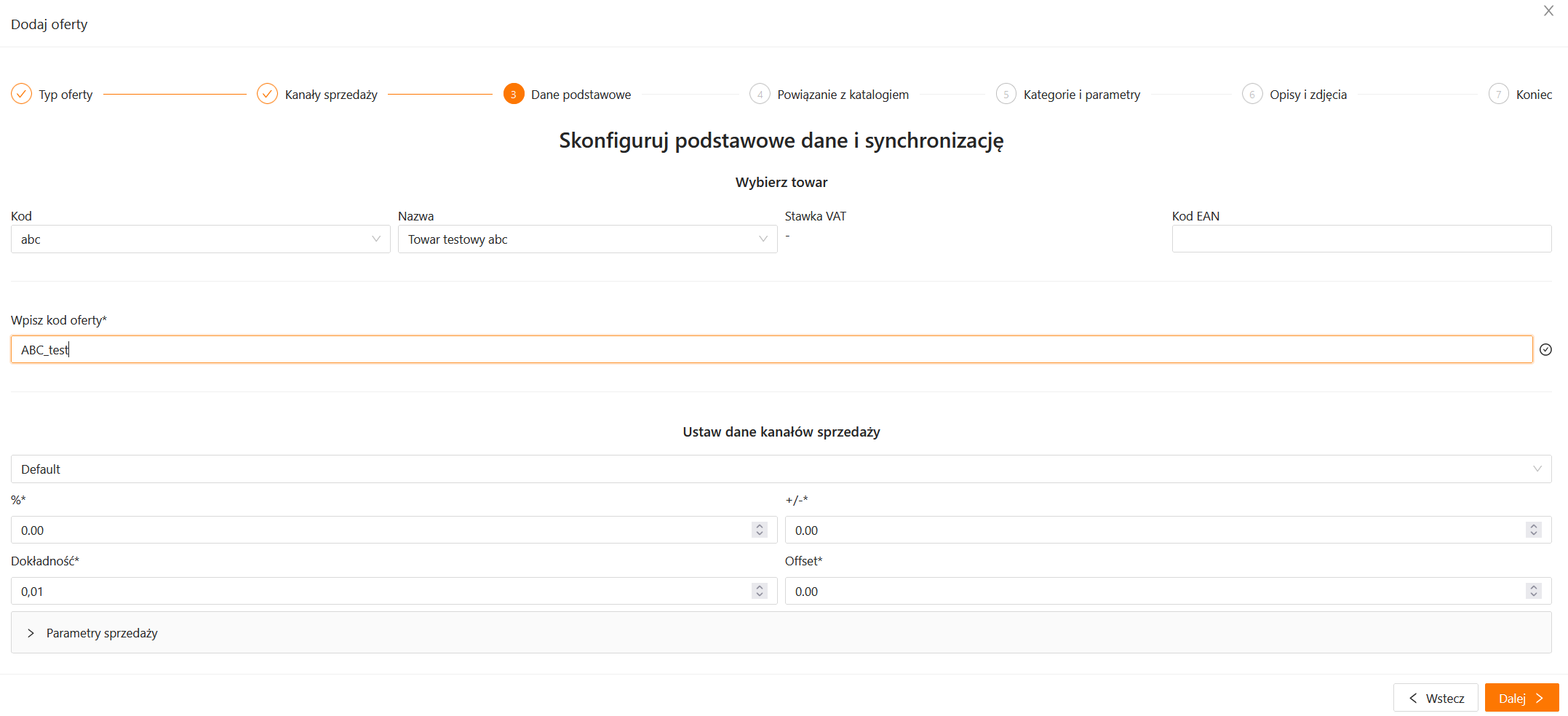 Ustal dane podstawowe oferty, takie jak kod oferty oraz dane kanału sprzedaży. Wskaż cennik, z którego będzie synchronizowana cena i dodaj marże lub rabaty.