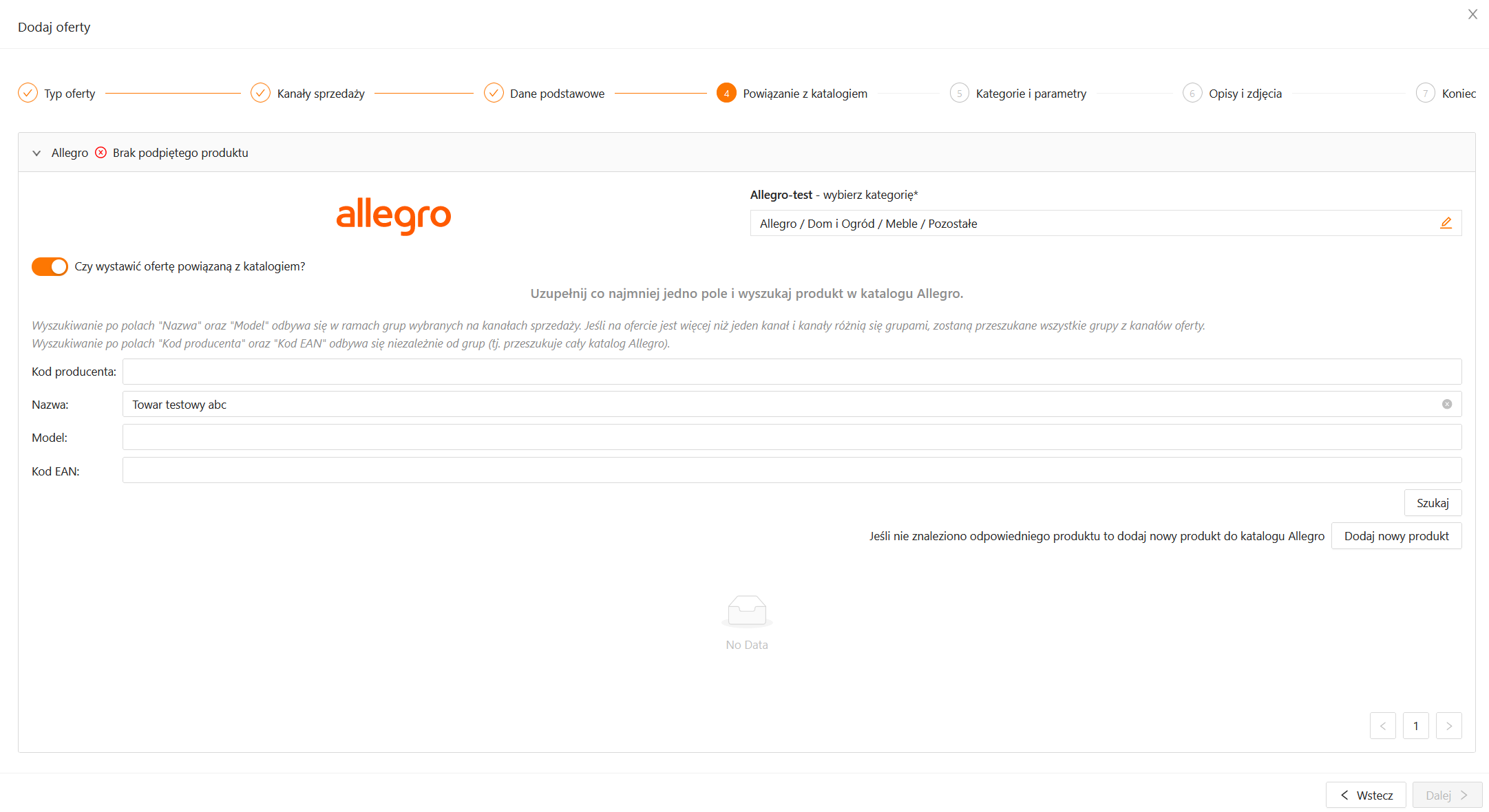 Jeżeli wystawiasz ofertę na kanale Allegro lub Amazon, w tym kroku możliwe jest wyszukanie produktu w katalogu i podłączenie go do oferty. Po podłączeniu produktu z katalogu dane takie jak parametry, opisy i zdjęcia produktu zostaną pobrane z katalogu, dzięki czemu od razu możesz wystawić ofertę. Jeśli tworzysz ofertę Allegro, możesz podać własne opisy i zdjęcia.