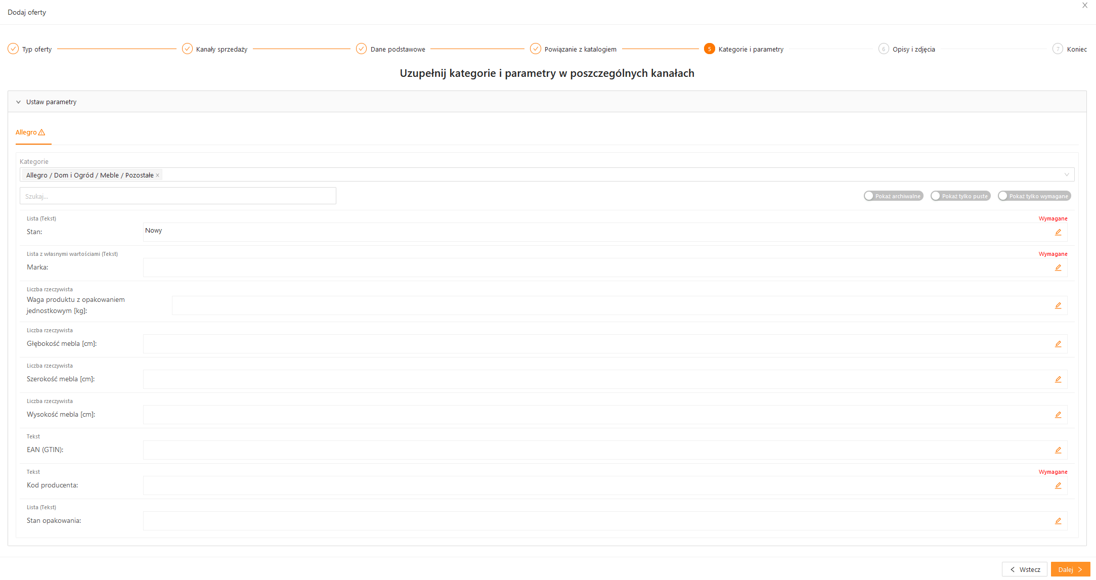 Ostatni krok pozwala uzupełnić parametry określające produkt. Lista parametrów jest importowana na bieżąco z konkretnych kanałów sprzedaży, dzięki czemu tworząc ofertę zobaczysz parametry dostępne dla danej kategorii.