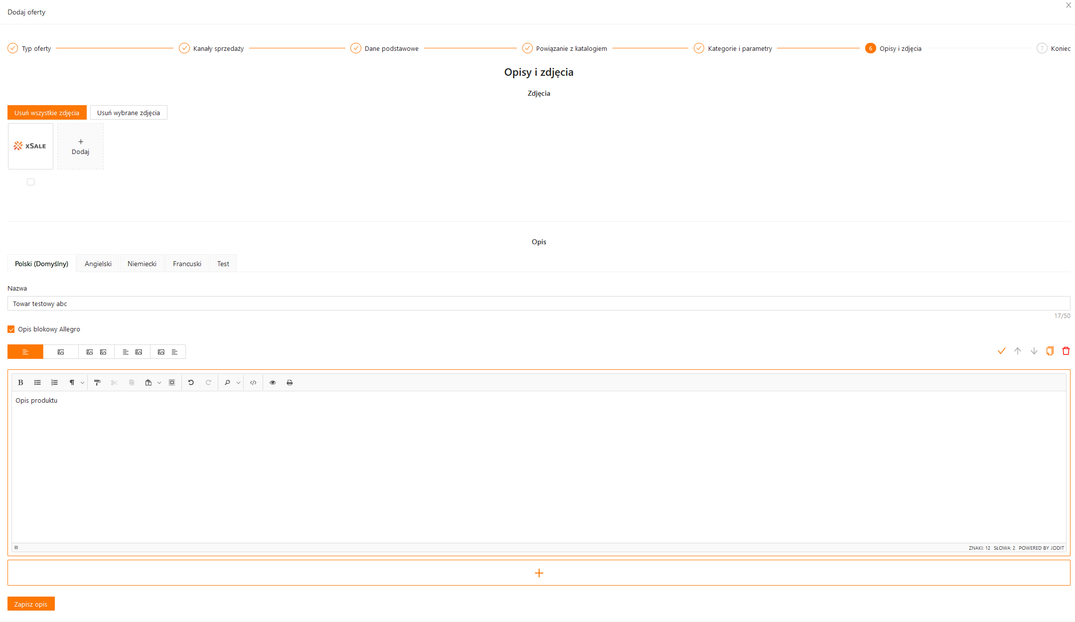 W tym kroku wprowadź opis produktu i dodaj zdjęcia, które mają zostać dołączone do oferty.