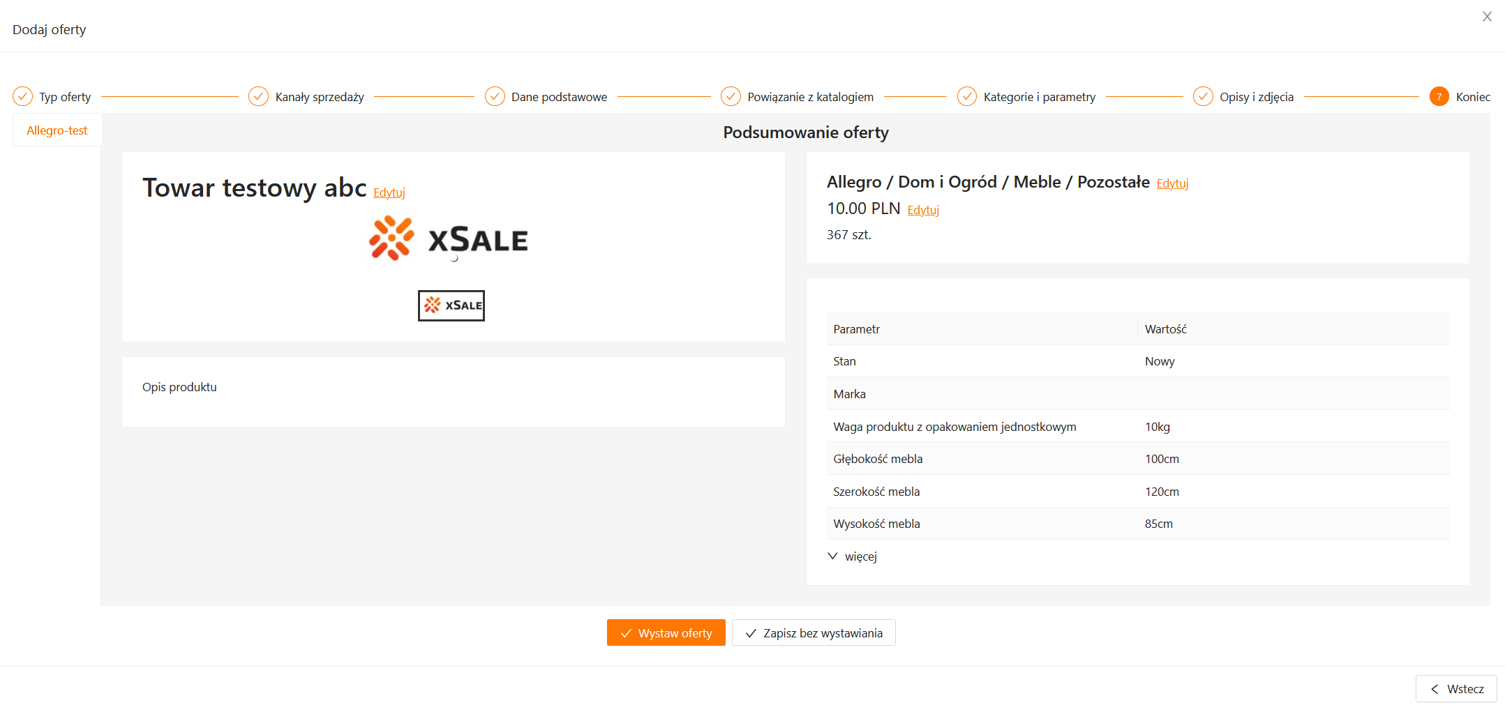 Po przejściu wszystkich kroków kreatora xSale wyświetli podsumowanie oferty. Strona podsumowania zawiera główne informacje o ofercie, które zostały uzupełnione w poszczególnych krokach kreatora. Jeżeli na tym etapie chcesz jeszcze poprawić ofertę, możesz edytować poszczególne elementy i przejść bezpośrednio do kroku, w którym dane zostały wprowadzone. Przycisk Wystaw oferty powoduje włączenia aktywności wybranych kanałów sprzedaży – oferta od razu jest przesyłana do platformy sprzedażowej lub sklepu. Opcja Zapisz bez wystawiania zapisuje ofertę, jednak bez aktywacji kanału sprzedaży. Taka oferta zostanie zapamiętana i jest dostępna do edycji na liście ofert.