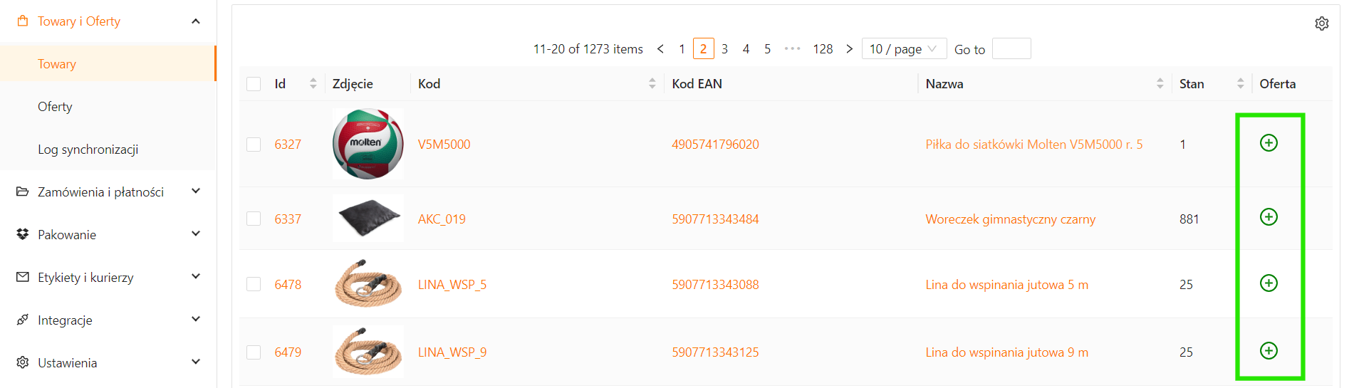 Aby utworzyć nową ofertę powiązaną z towarem przejdź do zakładki Towary i Oferty – Towary. Odszukaj wybrany towar na liście i kliknij + (plus) w kolumnie Oferta – zostanie uruchomiony kreator tworzenia oferty z towaru.