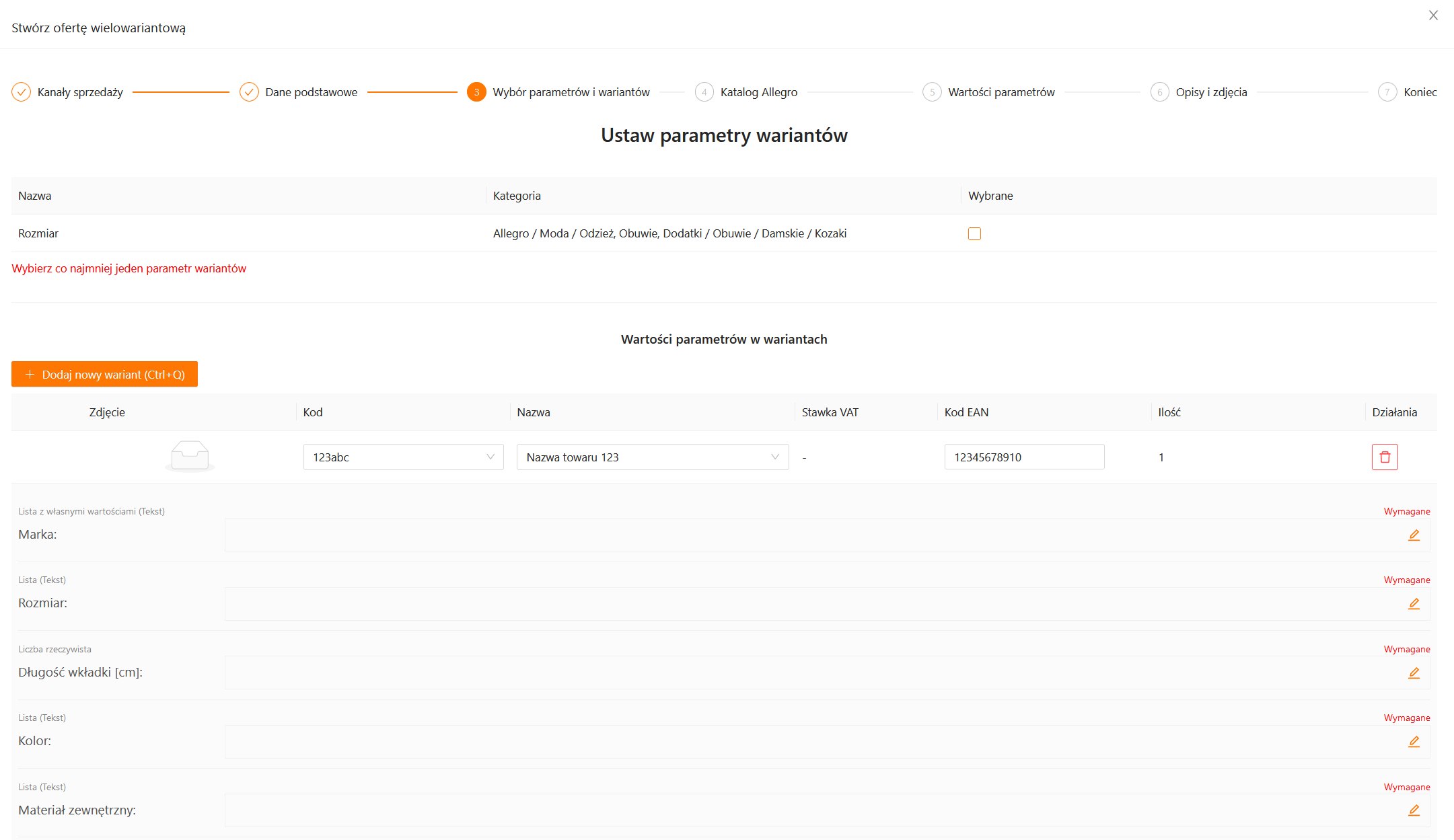 multivarianti kodów towarów. - W kroku 3 wskazujesz parametr wielowariantowy. System podpowiada parametry oznaczone jako wielowariantowe w wybranej kategorii. Musisz zaznaczyć co najmniej jeden parametr.