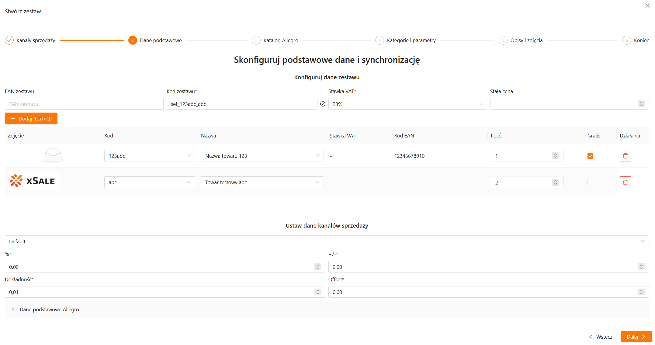 - W kroku 2 uzupełniasz dane zestawu: EAN zestawu, kod zestawu (domyślnie przedrostek