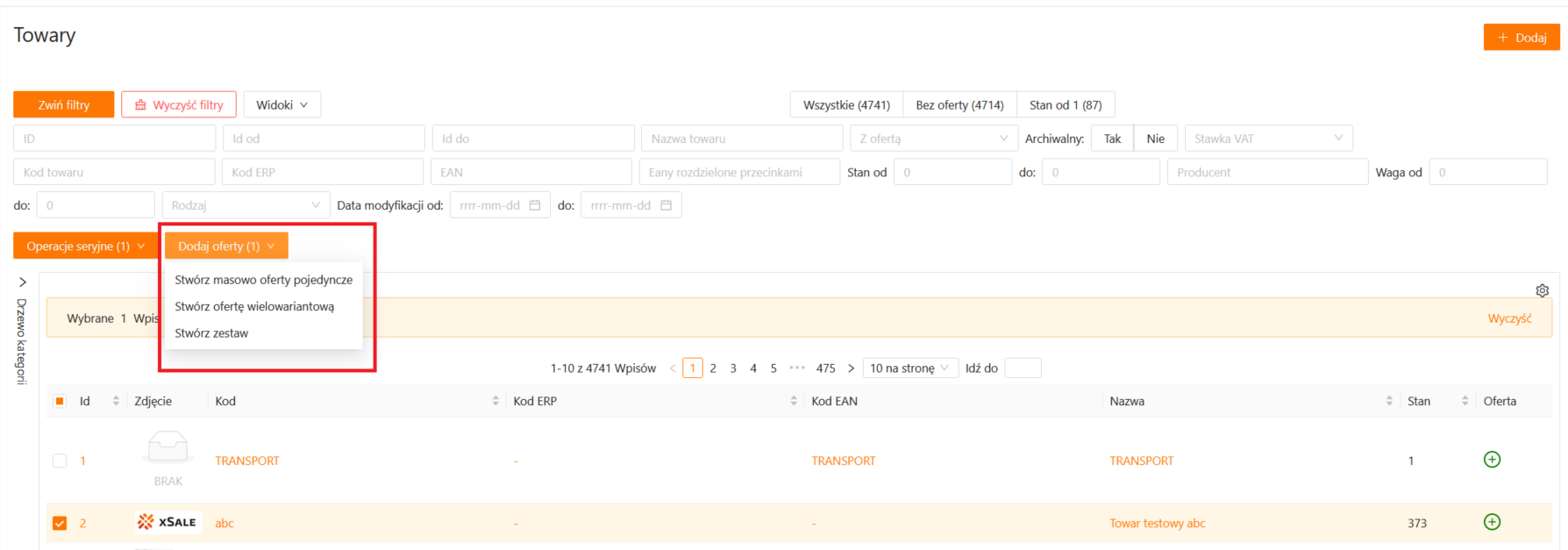 Ta opcja tworzy ofertę wielowariantową z zaznaczonych towarów.