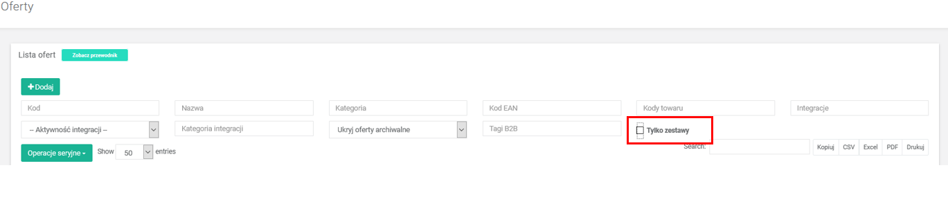 Oferty typu zestaw możesz łatwo filtrować na liście ofert (V1: Dane sprzedaży → Oferty).