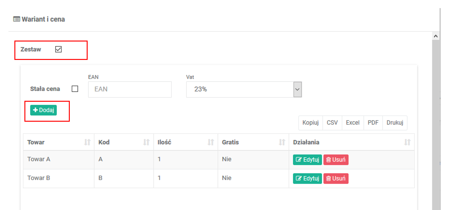 W xSale możesz tworzyć oferty typu zestaw (bundle), czyli oferty składające się z kilku towarów, w tym również z gratisów. Konfigurację wykonasz na ofercie, w sekcji Warianty i ceny.