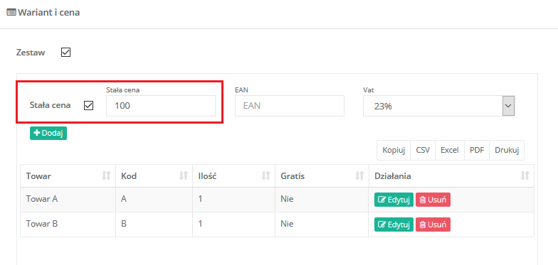 Cenę zestawu możesz ustalić ręcznie, zaznaczając opcję Stała cena. Typ ceny (brutto/netto) jest wtedy pobierany z domyślnej ceny w xSale.