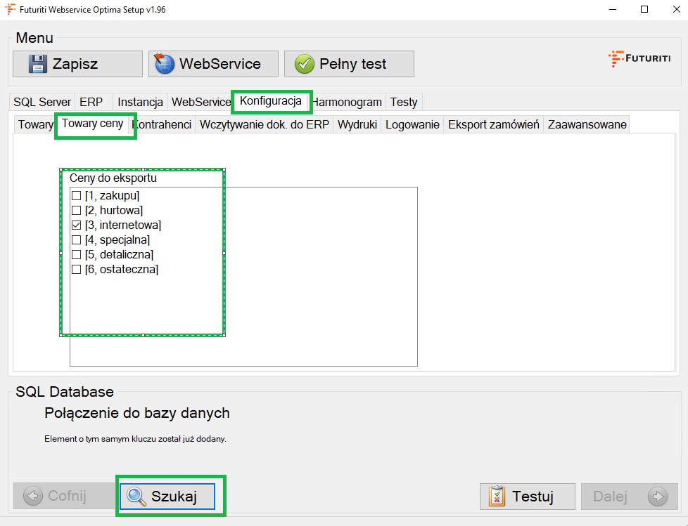 Ceny, które są synchronizowane do xSale (a następnie dostępne do wyboru podczas synchronizacji z kanałami sprzedaży) należy wskazać w Futuriti WebService Instance Manager. Aby to zrobić, otwórz Futuriti WebService i przejdź do zakładki: Konfiguracja ->Towary ceny. Następnie kliknij Szukaj, następnie wybierz ceny do synchronizacji i kliknij Zapisz. Potem przejdź do zakładki Harmonogram i kliknij kolejno przyciski Zatrzymaj i Uruchom.
