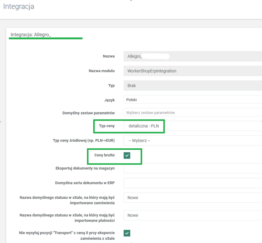 • Parametr wysyłaj ceny brutto – odznaczony (Konfiguracja /-> Ogólne /-> Integracje /-> np. Integracja Allegro_kontoAllegro /-> Edytuj / zapisz i przejdź do instalatora /-> 3 krok Typy Cen)