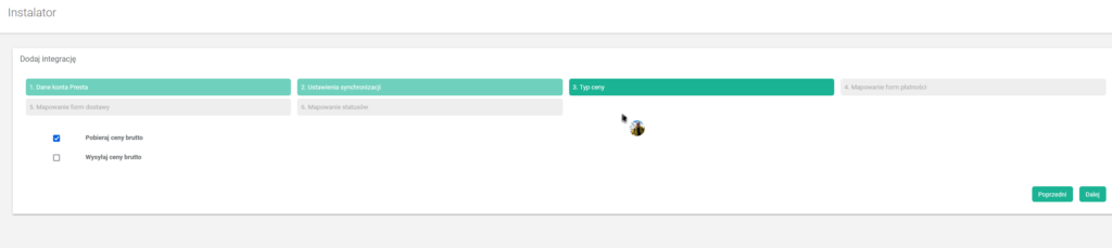 Konfiguracja /-> Ogólne /-> Integracje /-> np. Integracja Allegro_kontoAllegro /-> Edytuj / zapisz i przejdź do instalatora /-> 3 krok Typy Cen